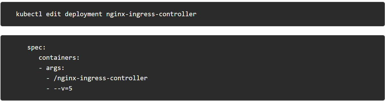 您可以通过添加 到 Kubernetes 部署的部分来将日志级别更改为 调试。请注意,必须使用 NGINX 部署构建 - 以便稍后获得调试日志。–v=5-args-with-debug