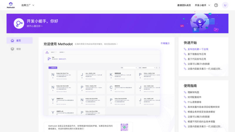 作为一款一站式云原生在线开发协作平台,Methodot 深度整合了云原生技术能力,并引入了大量研发辅助模块,通过对软件开发模式进行了完整的再造,为广大技术爱好者打造出了新一代的研发空间。