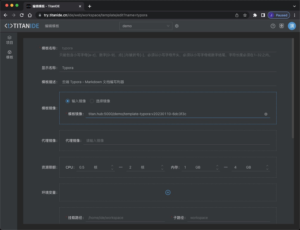 在制作好 Typora 模板镜像之后,将镜像地址复制出来,直接粘贴到模板下面模板镜像输入框即可,此外,您只需要填写模板名称,其它选填看您的需要,接着确认创建模板。